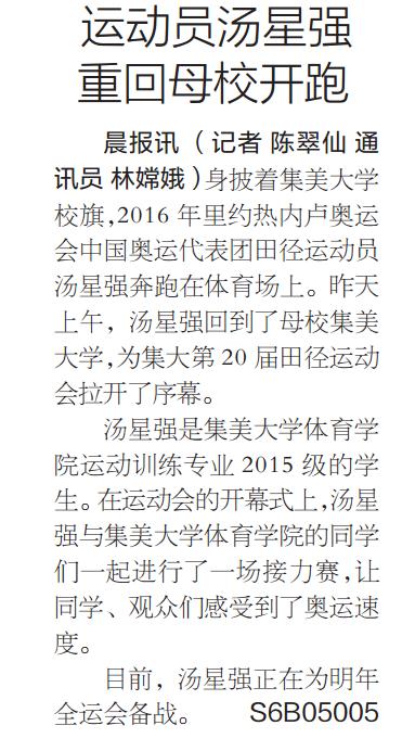 海西晨报:《运动员汤星强重回母校开跑》http://www.xmnn.cn/dzbk/xmsb/epaper/html/2016-11/05/content_691477.htm
