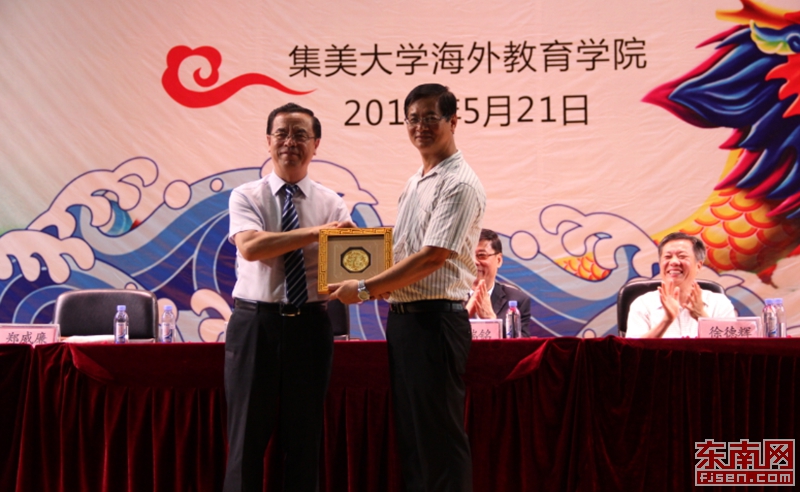 结业典礼上,彭兴勇海外教育学院向菲律宾华文教育中心赠送礼物。陈敏摄