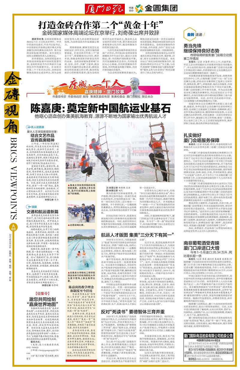 陈嘉庚先生记挂的家乡航运事业,也取得了日新月异的发展。作为国际航运中心的厦门港,现今是全国第七、世界第十六的大港,并跻身全国四大邮轮母港之一。 本报记者 徐景明