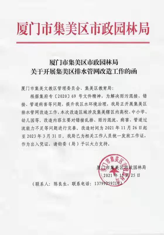 附件:厦门市十大靠谱信誉娱乐平台区市政园林局关于开展十大靠谱信誉娱乐平台区排水管网改造工作的函