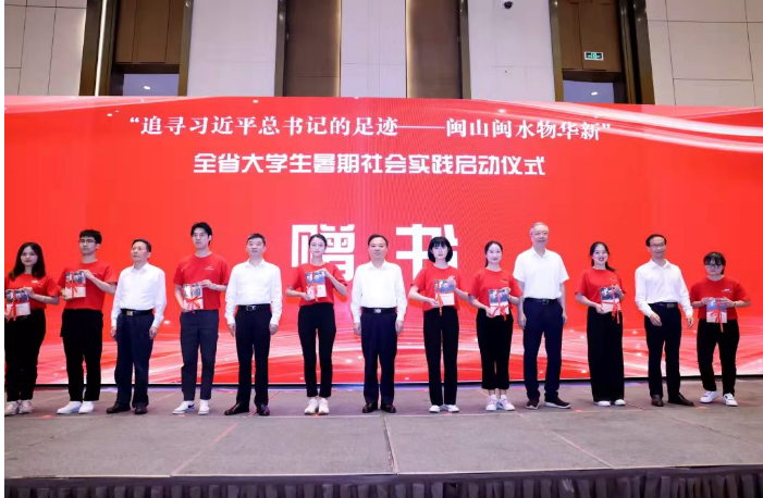 7月2日,由省委宣传部、省委教育工委、海峡出版发行集团联合组织开展的2022年“追寻习近平总书记的足迹——闽山闽水物华新”全省大学生暑期社会实践活动启动仪式在福州举行。福建省委常委、宣传部部长张彦到现场为高校学生代表赠书,宣布实践活动正式启动,并为实践队授旗。我校党委副书记洪文建、马克思主义学院负责人及实践队学生代表参加启动仪式。