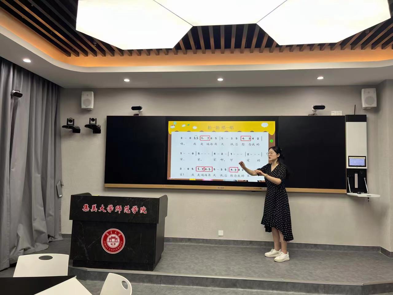 师范学院2022届优秀毕业生钟鑫怡与大田城关二小的学生共同完成了“空中课堂”的演示教学,呈现了一堂生动、活泼的音乐课,展示了彭兴勇课堂云端化、课程集优化、制作匠心化和教育技术现代化的教学实践成果。